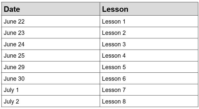 Summer classes are different than normal semester classes. We will have 8 classes. 4 days for 2 weeks.